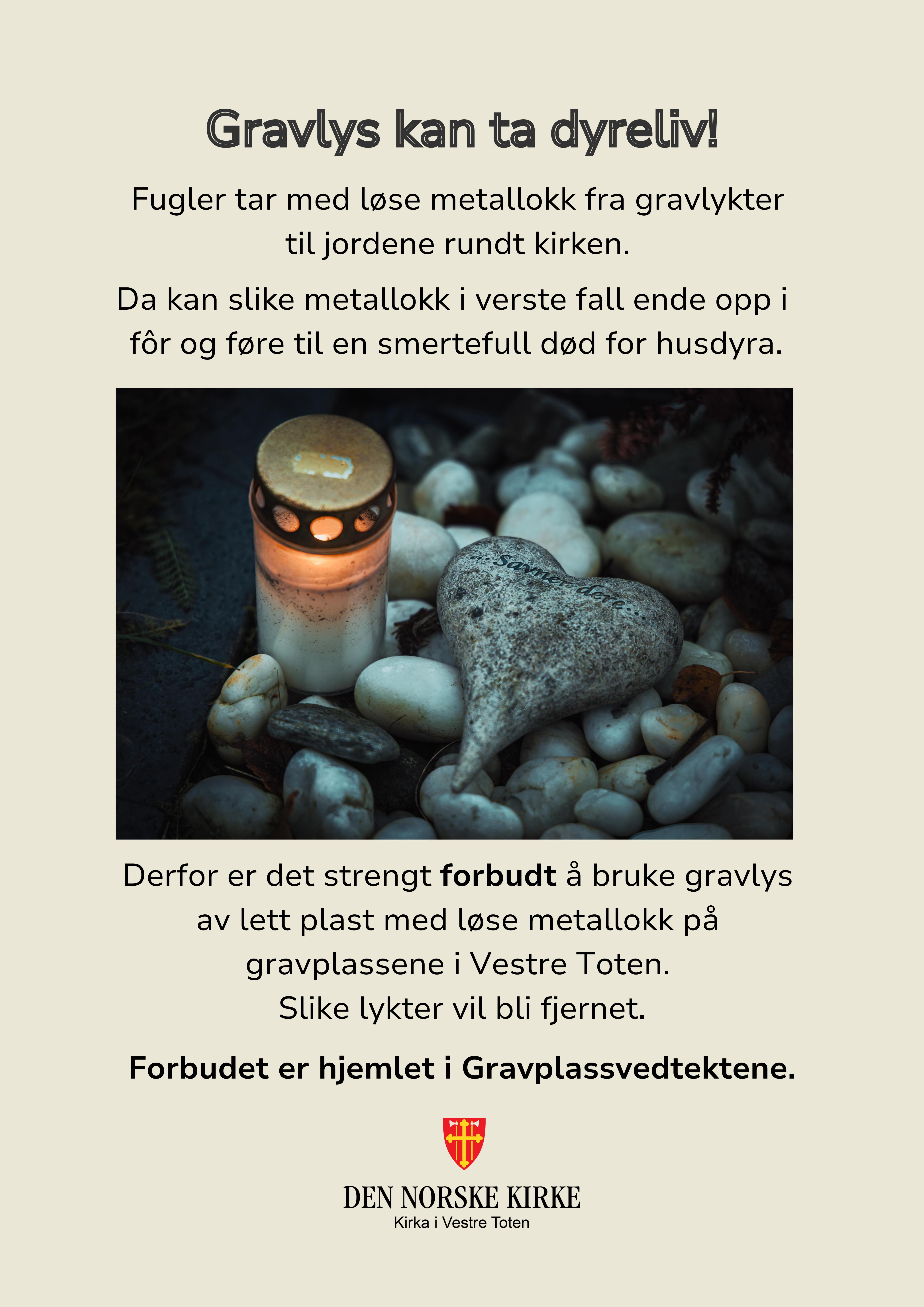 På gravplassen er det stadig større bevissthet rundt at lette og billige gravlys kan medføre livsfare for husdyr og andre dyr som har tilhold i nærheten av gravplassen.