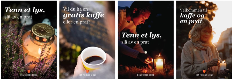 Åpne kirker gir folk mulighet til å tenne lys og minnes sine kjære.Budskapene i materiellet som er tilgjengelig på Ressursbanken er rom for bønn, rom for savn, rom for håp og rom for å minnes. Nye bilder ble tatt i 2022, og gjenbruk fra både 2019 og i fjor er selvfølgelig helt greit. Det finnes plakater, bilder til trykksaker og sosiale medier med oppdaterte datoer her i Ressursbanken. Her er også maler for plakater til gatebukk, strandflagg og rull-opp. Mal for T-skjorter vil komme i begynnelsen av oktober.